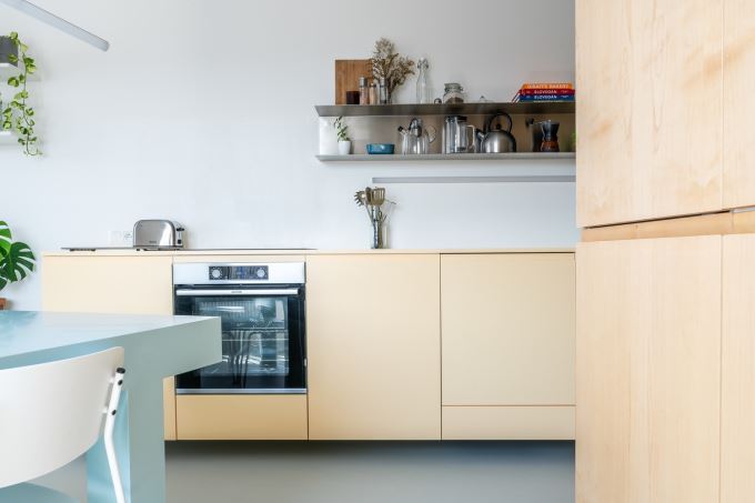 Màu vàng be của tủ bếp khơi gợi sự năng động, sáng tạo trong căn hộ Apartment B