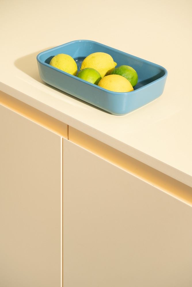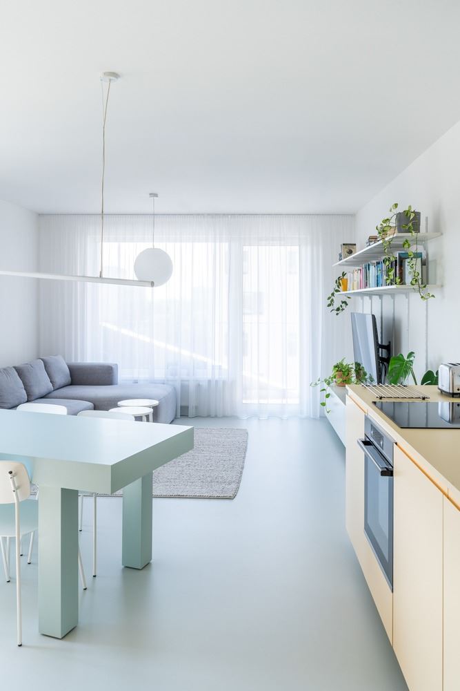 Khi thiết kế Apartment B, nhóm kiến trúc sư lựa chọn màu sắc như công cụ phân vùng tinh tế, đồng thời gợi mở cảm xúc khác nhau trong từng khu vực. Màu vàng rực rỡ được dùng cho bếp và bàn làm việc, khơi dậy sự năng động và sáng tạo. Trong khi đó, sắc xanh nhạt nhẹ nhàng xuất hiện tại khu tiếp khách, từ bàn bếp chính đến ghế dài lối vào, tạo nên sự thư thái và cởi mở.