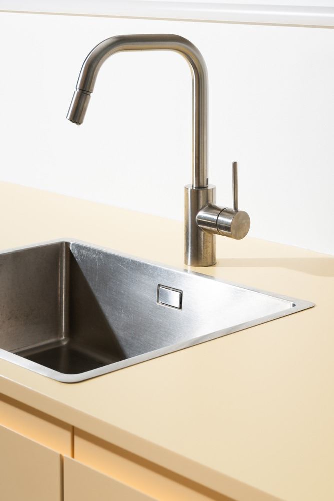 Chi tiết bồn rửa bằng thép không gỉ trên nền vàng be tươi sáng