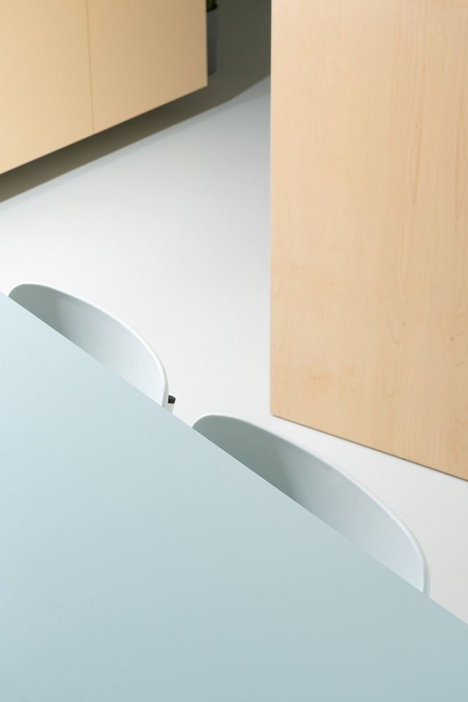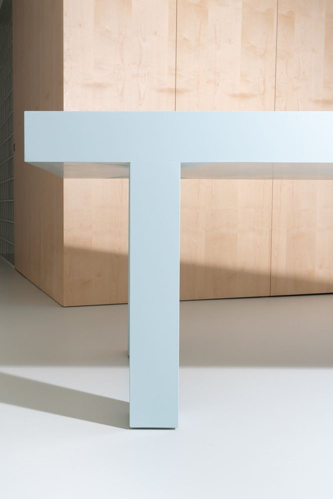 Mặt bàn màu xanh lam nhạt gợi cảm giác thư giãn và mát mẻ trong khu vực sinh hoạt chung