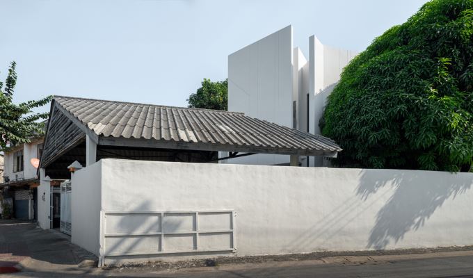 Mặt tiền của ngôi nhà được hoàn thiện bằng lớp sơn trắng với những đường rãnh có họa tiết, tạo nên một diện mạo đặc biệt