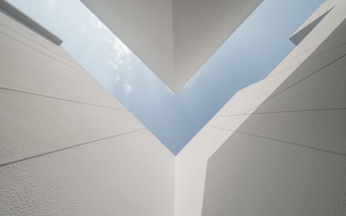 Từ bên ngoài, mặt tiền của ngôi nhà trông như được tạo thành từ các mặt phẳng nghiêng được ghép lại với nhau