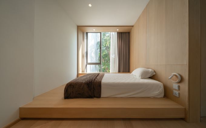 Phòng ngủ khá tối giản, đề cao sự ấm cúng và thư giãn