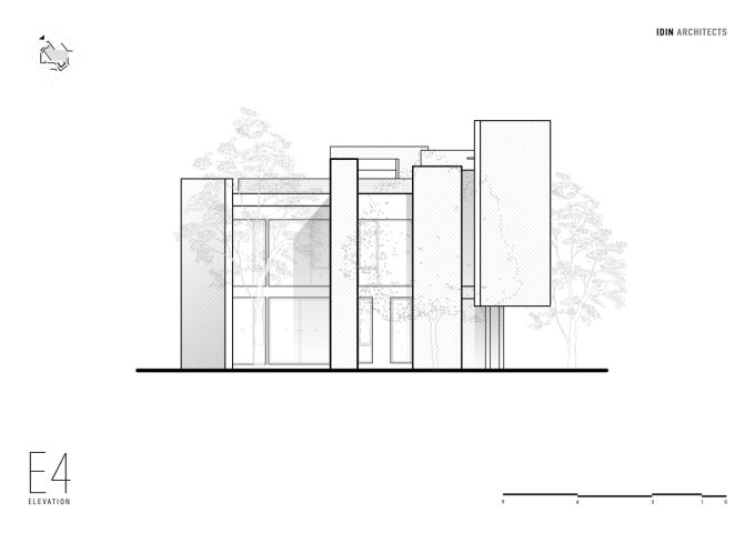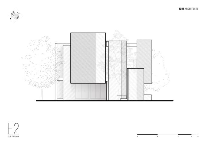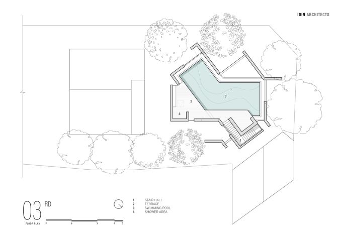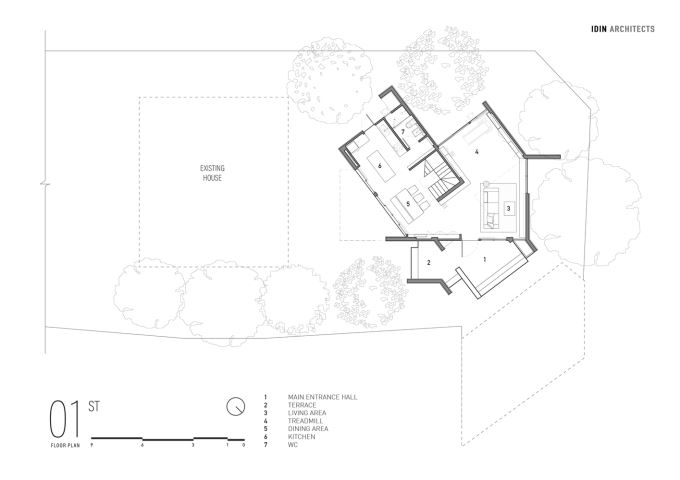 Điều này tạo ra một kế hoạch độc đáo, với các khối kiến trúc xoay chuyển để tránh những cây và đồng thời tạo ra góc nhìn riêng cho từng căn phòng