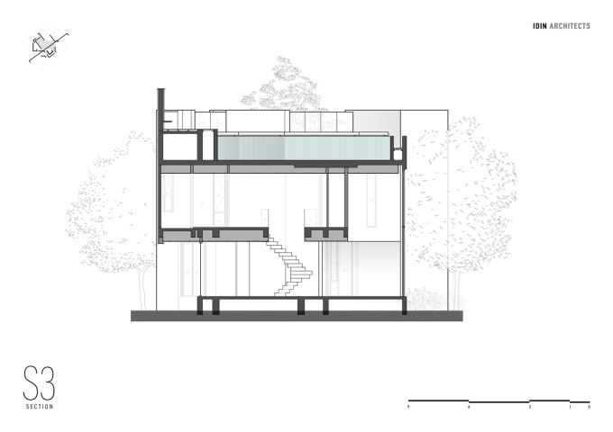 Một trong những yêu cầu quan trọng của chủ nhà là M House phải kín đáo, có tính riêng tư cao. Vì vậy, kiến trúc sư đã quyết định giữ lại cấu trúc lối vào của bãi đỗ xe cũ để giúp che khuất tầm nhìn từ con đường chính, đồng thời lựa chọn chiều cao của ngôi nhà ngang bằng với các tán cây hiện có để ẩn giấu ngôi nhà khỏi tầm nhìn của người đi đường.