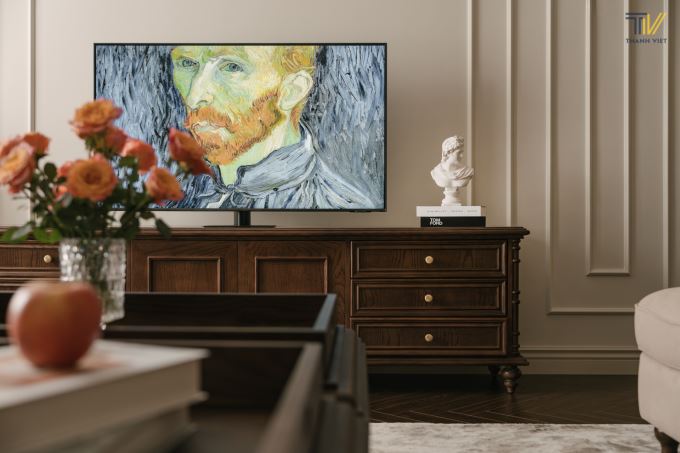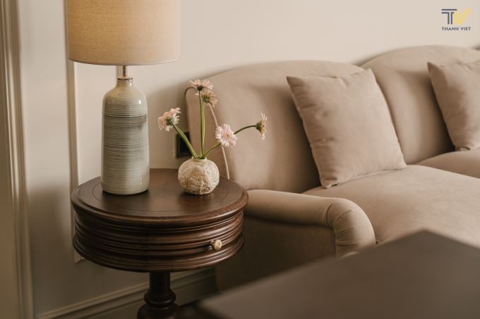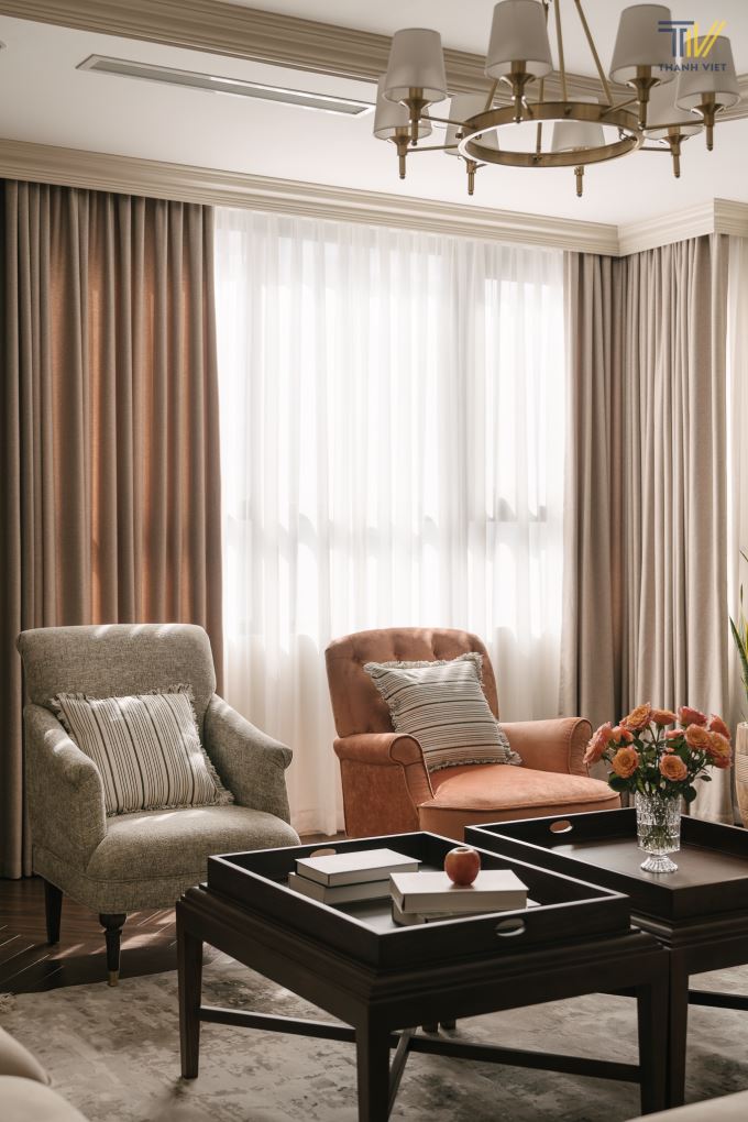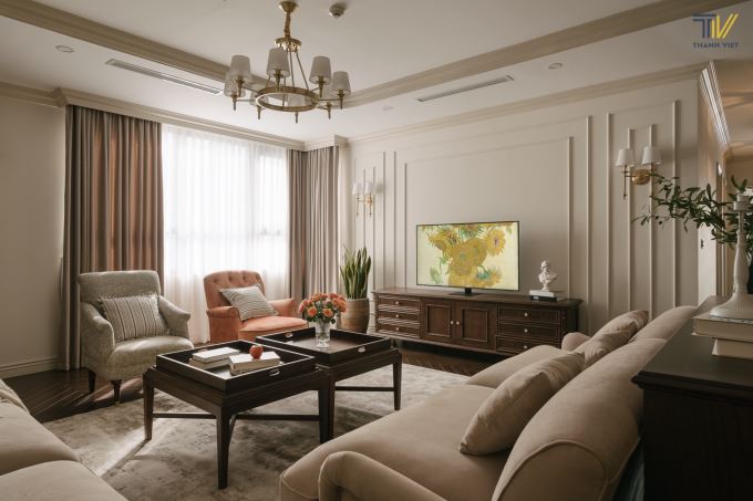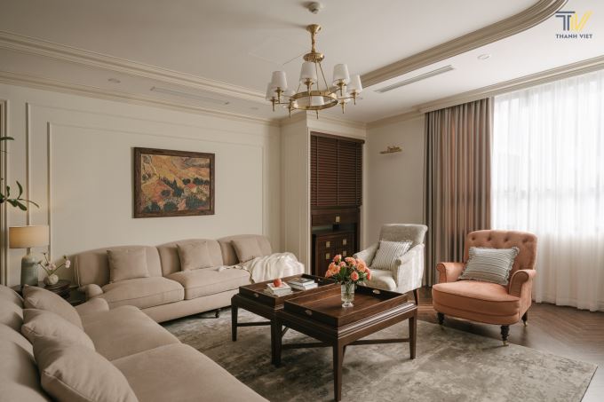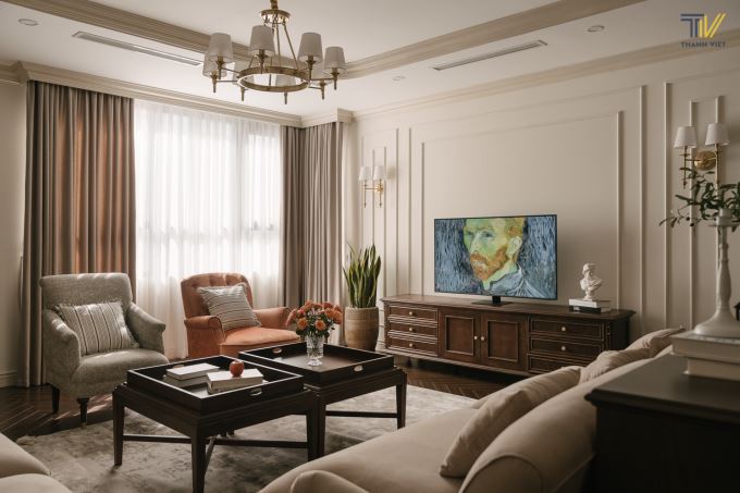 Phòng khách “khoác lên mình” sắc kem be nhẹ nhàng. Tone màu nâu trầm của gỗ đến từ đồ nội thất như bàn trà, tủ TV, tủ sau sofa, sàn gỗ,... cho căn phòng mang vẻ cổ điển, trầm nhẫn. Tuy nhiên, chiếc armchair màu cam là điểm sáng, giúp cân bằng lại màu sắc không gian phòng.