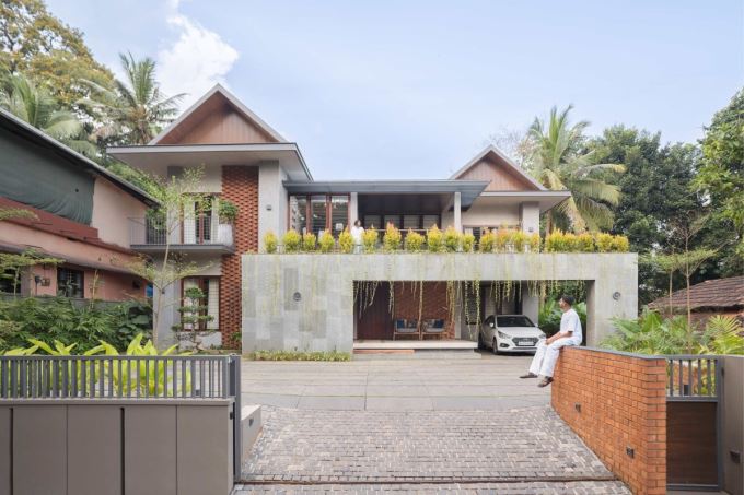 Mặt tiền Mausam House với gạch đỏ xếp hoa văn và cây xanh phủ mái, tạo vẻ đẹp mộc mạc hòa quyện thiên nhiên. Thiết kế mở giúp ngôi nhà tận dụng ánh sáng và gió trời