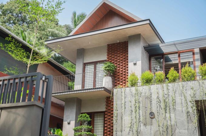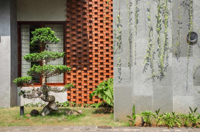 Mặt ngoài Mausam House với chi tiết tường gạch đỏ hoa văn và cây xanh bonsai điểm xuyết. Thiết kế này vừa mang tính thẩm mỹ, vừa phản ánh tinh thần gắn bó với thiên nhiên