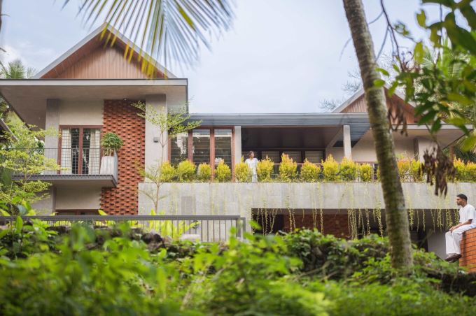 Toàn cảnh Mausam House nhìn từ xa cho thấy sự kết hợp giữa kiến trúc hiện đại và cảnh quan xanh mát của Kerala. Ban công trồng cây dài tạo lớp đệm thiên nhiên che nắng, giảm nhiệt