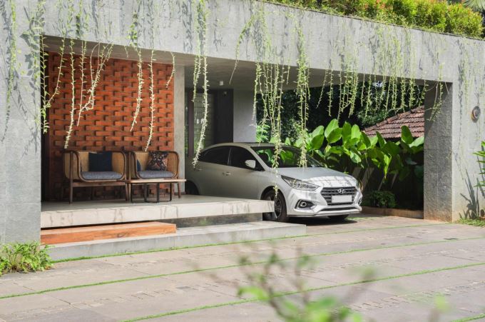 Khu vực hiên trước và gara của Mausam House kết hợp ghế nghỉ, vừa tiện lợi vừa gần gũi thiên nhiên. Gạch đỏ và cây xanh mang lại cảm giác ấm áp, thân thiện