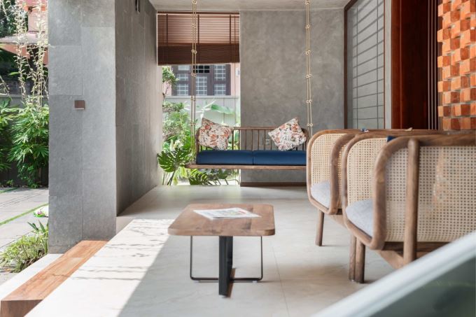 Góc thư giãn với ghế mây và xích đu gỗ treo trong khoảng sân mở của Mausam House. Đây là không gian kết nối trong – ngoài, mang lại sự thoải mái tự nhiên
