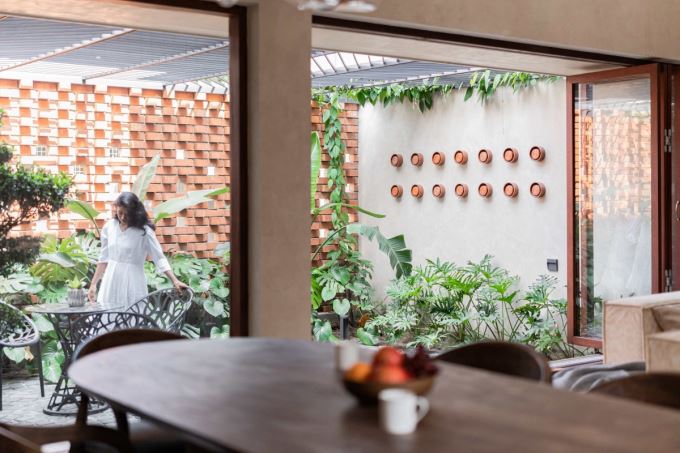 Khoảng sân trong với tường gạch đỏ và giàn cây leo, nơi ánh sáng và gió tự nhiên tràn vào. Đây là “trái tim xanh” của toàn bộ ngôi nhà