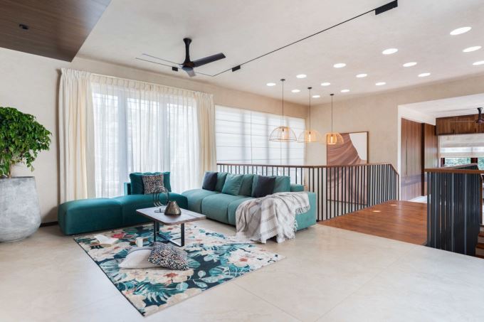 Phòng sinh hoạt chung trên tầng hai với sofa xanh nổi bật và ánh sáng tự nhiên chan hòa. Thiết kế mở giúp nơi đây trở thành không gian quây quần ấm cúng cho gia đình