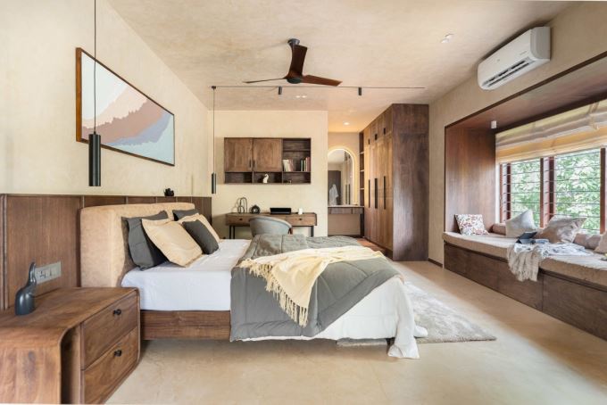 Phòng ngủ chính trong Mausam House sử dụng gỗ bản địa làm nội thất chủ đạo, mang đến cảm giác ấm áp và sang trọng. Các ô cửa kính lớn mở ra tầm nhìn xanh mát từ bên ngoài