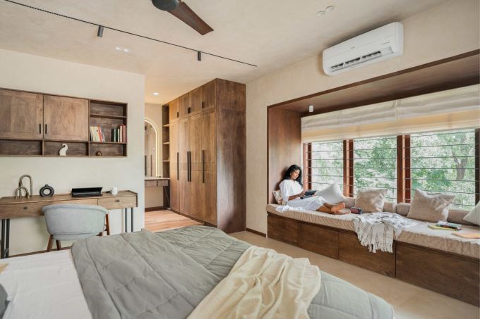 Đặc biệt, nội thất được hoàn thiện bằng gỗ Kumizh bản địa – loại gỗ có giá trị văn hóa cao tại Kerala. Gỗ được dùng cho hệ cửa, vách ngăn, ốp tường và cả đồ nội thất đóng riêng, mang lại sự ấm áp, mềm mại, cân bằng lại chất công nghiệp của bê tông. Nhờ đó, không gian vừa hiện đại vừa phảng phất tinh thần truyền thống.