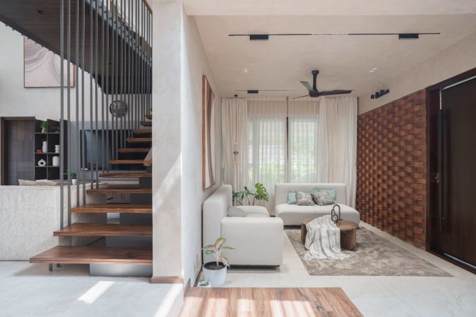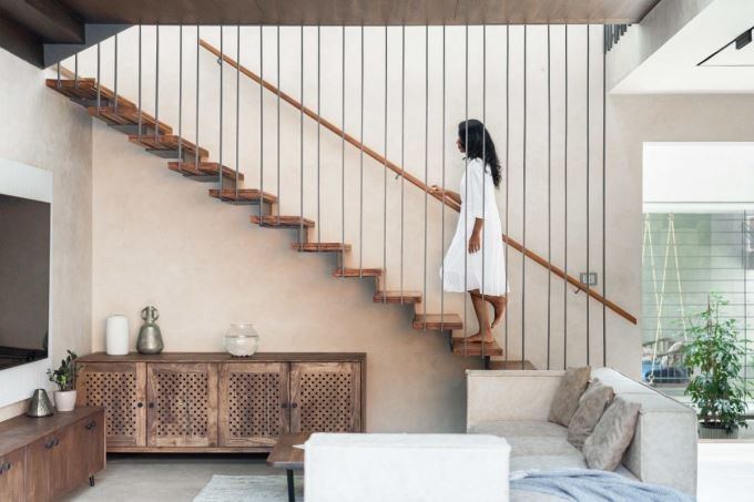 Cầu thang gỗ thang bay kết hợp lan can thép mảnh trong Mausam House, tạo cảm giác nhẹ nhàng và hiện đại. Thiết kế này giúp không gian phòng khách thêm thoáng sáng và sang trọng