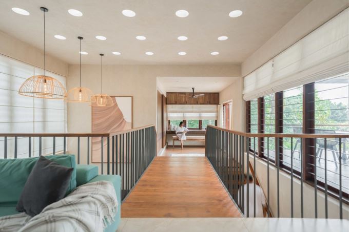 Hành lang tầng trên của Mausam House được chiếu sáng tự nhiên nhờ hệ cửa kính lớn. Không gian này kết nối trực tiếp với các phòng sinh hoạt và góc thư giãn hướng ra thiên nhiên