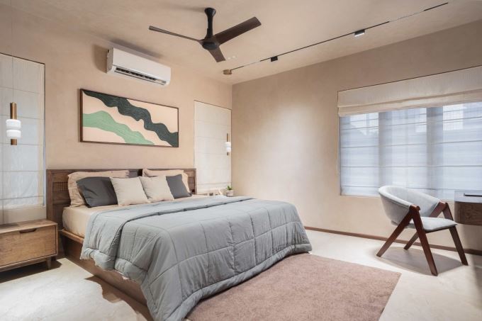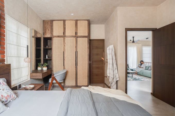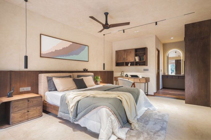 Một phòng ngủ khác trong Mausam House được thiết kế tối giản, trang nhã với gam màu sáng. Nội thất gỗ và rèm vải tạo sự ấm áp, phù hợp cho không gian nghỉ ngơi