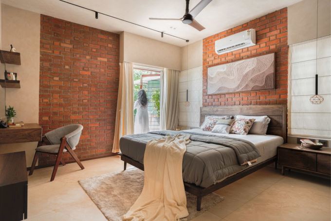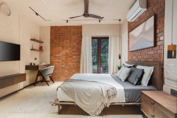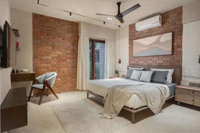 Phòng ngủ phụ với tường gạch đỏ lộ thiên tạo điểm nhấn thô mộc, gần gũi. Nội thất gỗ và tông màu trung tính mang lại cảm giác ấm áp và hiện đại