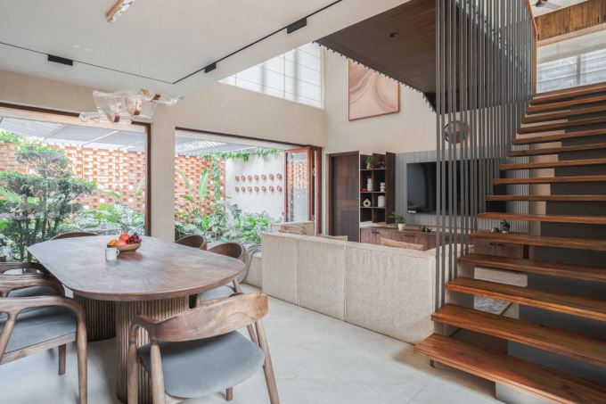 Không gian phòng ăn và phòng khách liên thông, với cầu thang gỗ thang bay hiện đại làm điểm nhấn. Bố trí mở giúp ánh sáng tự nhiên luôn chan hòa