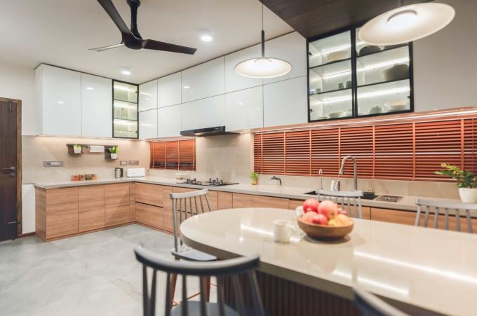 Khu bếp hiện đại với nội thất gỗ Kumizh bản địa, hệ tủ tối giản và ánh sáng dịu. Đây là sự kết hợp hài hòa giữa tính tiện nghi và nét mộc mạc truyền thống